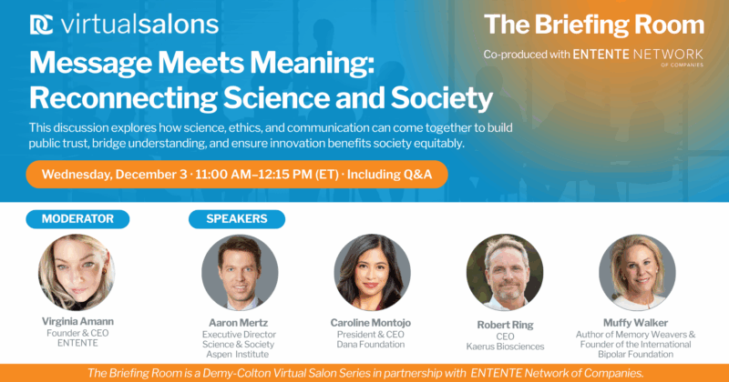 In a rapidly changing world, scientific discovery has the power to transform the health and wellbeing of everyday people — yet the pace of innovation often outstrips public understanding, policy adaptation, and ethical reflection. This session of The Briefing Room explores how to close that gap: How can we make complex science and ideas relatable without diluting their substance? What systems and ethical frameworks can ensure that science serves society equitably and transparently? And what roles do communicators, creatives, and civic leaders play in building trust and meaning around science in public life? This is a conversation about responsibility, relevance, and the future of innovation in society. By integrating ethics, communication, and systems designed to connect discovery with lived experience, this conversation aims to inspire a new paradigm: one where innovation thrives through inclusive conversation, transparency, and shared purpose.